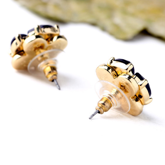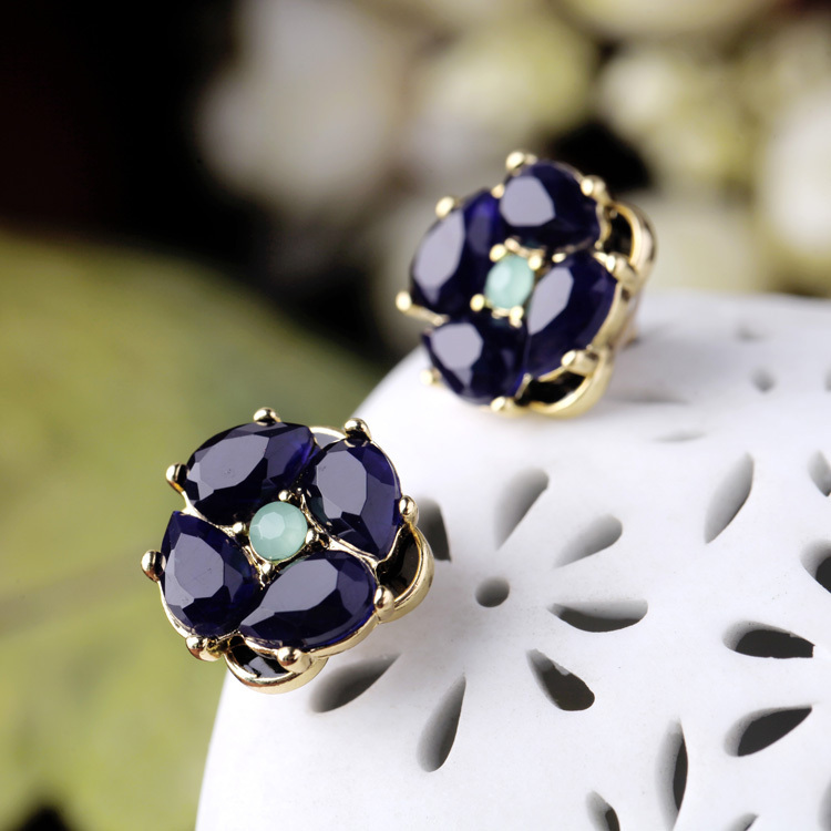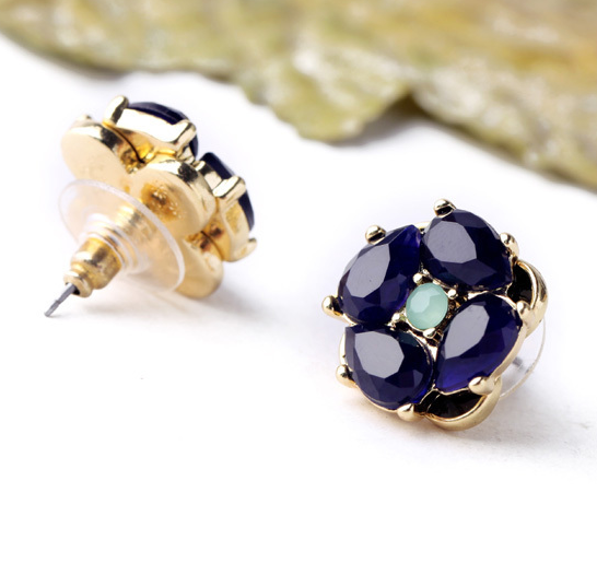 Nestled in a gleaming antique-gold setting, faceted navy petals delicately hug mint green center stones. These pretty studs will add a touch of sweetness to any ensemble.