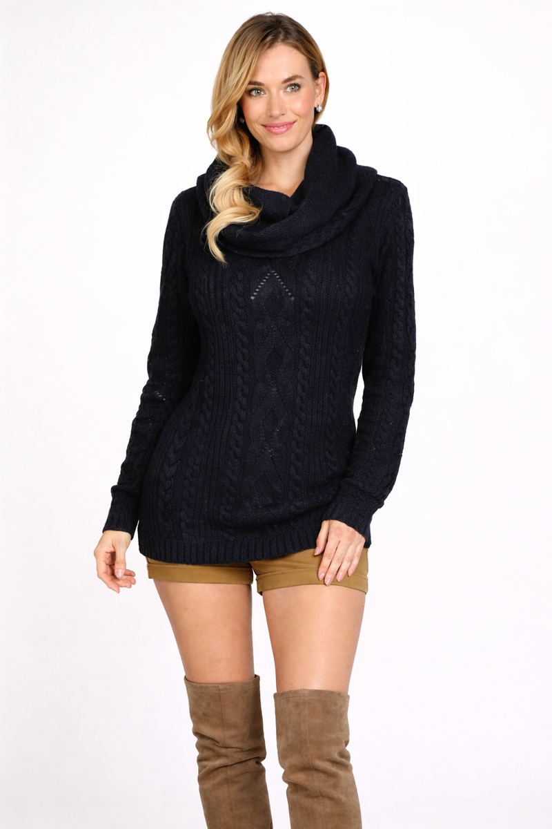M-Rena Cable Knit Tunic Sweater W/ Detachable Cowl Neck