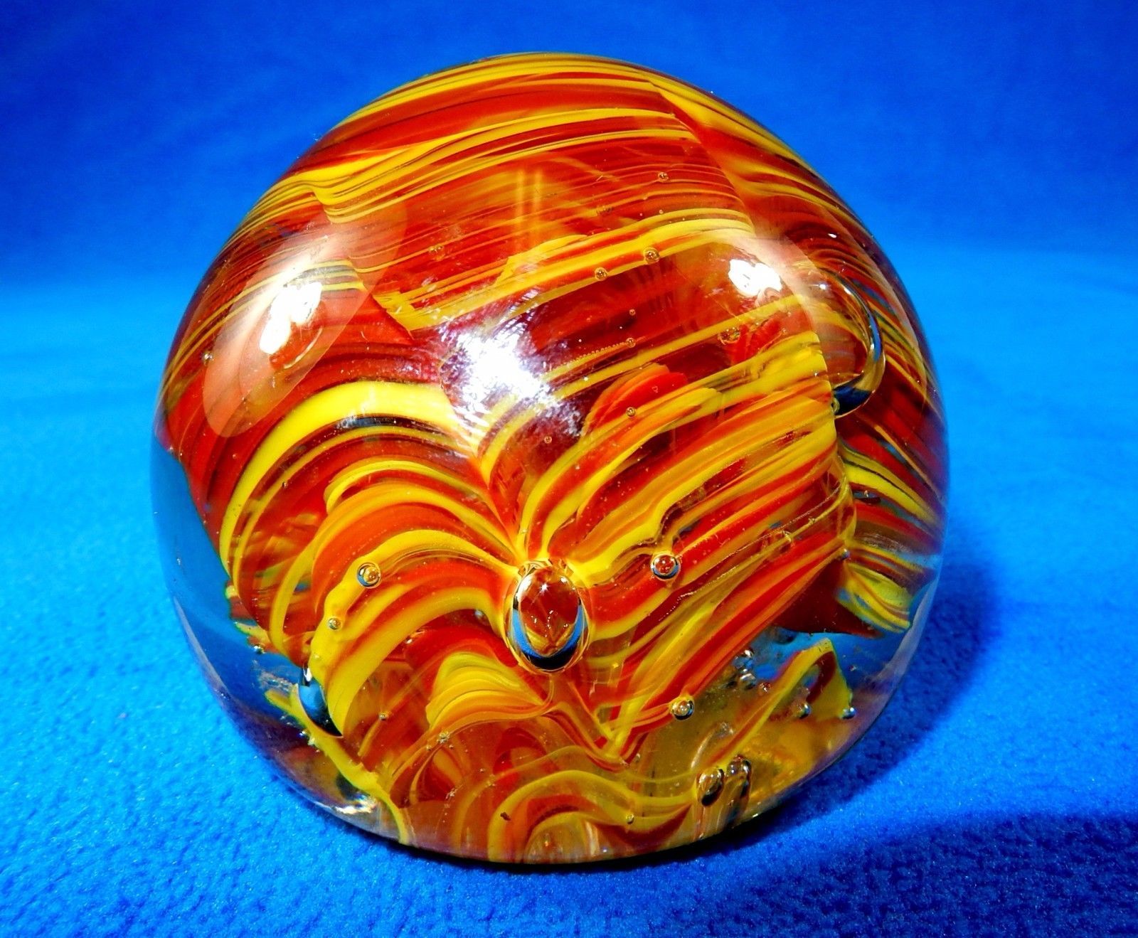Beautifully crafted hand-blown glass paperweight with decorative artwork