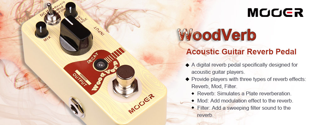 MOOER's NEW WoodVerb with MOD and FILTER + PC-Z ConnectorA must for acoustic guitar players If you are an Acoustic Guitar Player and are tired of the monotonous sound that comes out from your guitar and have the passion that nothing less than an electric guitar player โ OK, then, please checkout this WoodVerb Acoustic Guitar Reverb Pedal. WoodVerb is a digital reverb pedal specifically designed for acoustic guitar players, its goal is to provide the users with the most direct experience of using the reverb effect. Do not get fooled by its Mini and mild outlook, WoodVerb provides three high quality and professional reverb modes as well as a wide variety of adjustment options. Let's forget about those Room, Hall reverb that always follow the same pattern. WoodVerb provides you with REVERB โ Splendid plate reverb which gives you an experience from the smallest room to the largest space; Mod โ Adds modulation effect to the reverb and creates a psychedelic effect; Filter โ Adds a sweeping filter sound to the reverb and makes it feel like a swirling windโฆOf course you do not need to worry that your acoustic guitar will sound like an electric guitar, the special circuit design can keep the original acoustic sound intact and pure while achieving a fabulous reverb effect. WoodVerb will be a must in those acoustic guitar players' tone arsenal. Tone introductionWoodVerb has three reverb modes: Reverb/Mod/FilterReverb: Simulates a Plate reverberationMod: Adds modulation effect to the reverbFilter: Adds a sweeping filter sound to the reverb A wide range of adjustment optionsThree reverb modes with MIX, DECAY and TONE knobs, providing you with a wide range of tone adjustment as well as inspiring your endless creativity! Simple and direct operation, toggle the switch can switch between different reverb effects. Nothing complicated, get you plug and play right away. The MIX knob can control the ratio of guitar dry sound and the effect sound. The TONE knob controls different parameters under different modes. The DECAY knob controls the decay level of the reverb effects. Excellent outlookThe outer shell of this pedal is screen printed with exquisite wood carving to highlight its acoustic nature. Tiny sizeInherit the Mini size of the MICRO SERIES pedals, your pedal board can have more space and therefore you can put more pedals in it. True BypassWhen WoodVerb is bypassed, it will not affect the original signal, which ensures the signal integrity . Input: 1/4โ monaural jack (impedance: 470k Ohms)Output: 1/4โ monaural jack (impedance: 100 Ohms)Power Requirements: AC adapter 9V DC (center minus plug),recommended to use Mooer Micro PowerCurrent Draw: 130 mADimensions: 93.5mm (D) 42mm (W) 52mm (H)Weight: 145g
