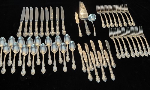COMPLETE FLATWARE SETHOSTESS HELPERSHOLLOWWARE / TEA SETSMUSEUM QUALITY/FIGURAL SILVERFINE ESTATE VINTAGE JEWELRYMID-CENTURY MODERNSILVER FLATWARE SILVERWAREBuccellatiChristofleGeorg JensenNew Georg Jensen HollowwareNew Georg Jensen JewelryGorhamInternationalLuntMichael Aram - NewReed BartonTiffany Co.TowleWallaceWhitingPLACE SETTINGS