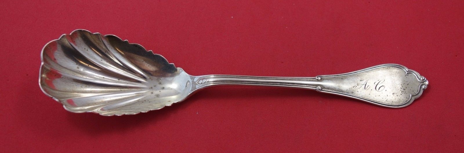 Gothic aka Eureka by Vanderslice sterling silver Preserve Spoon Shell Bowl, 7 1/4". It is monogrammed (monos vary) and is in excellent condition. Rare Early San Francisco California Silver.