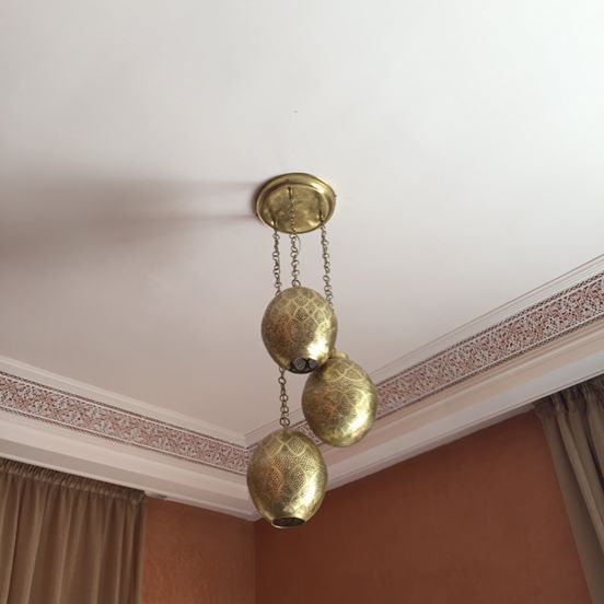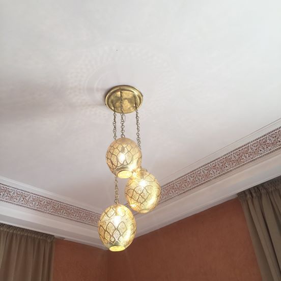 A ceiling of 3 brass eggs about 30cm high, which will add a touch of craftsmanship to your interior by diffusing a reflection on the ceiling and walls, and illuminate the room.