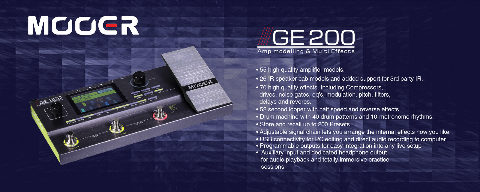 MOOER has unleashed a brand new multi effects processor which delivers unparalleled amp modelling in its price range and an amazing array of effects and features which will surely impress even the most disconcerting of tone chasers. The GE200 has been designed from the ground up to be the musicians perfect partner. Be it live on-stage, in the recording studio or back home in the practice den.