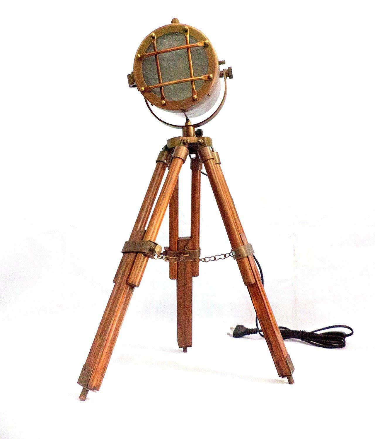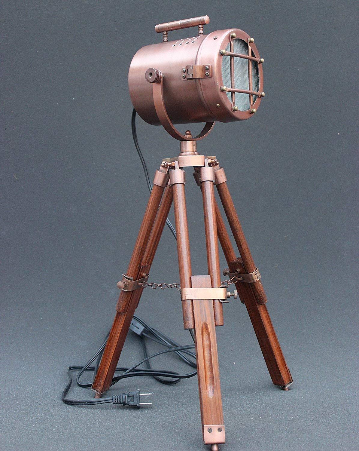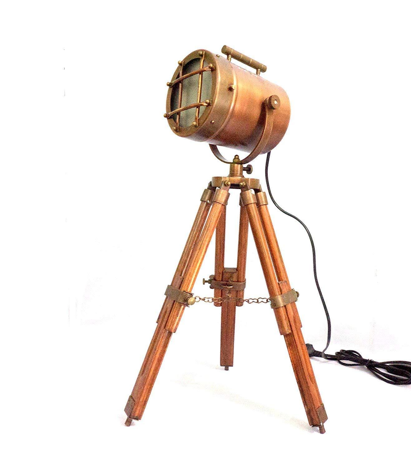 Copper antique finish searchlight tripod desktop decorative lamps give you antique look and feel , these lamps are manufactured using ancient ship head design onto newly designed telescopic tripod, tripod is adjustable to various height from 18 "