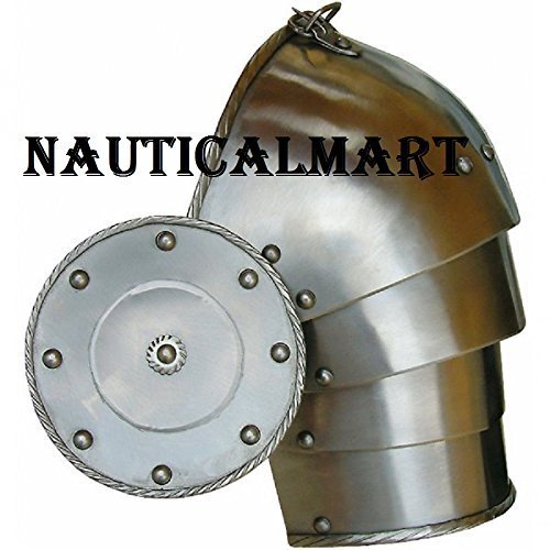 Medieval Steel Pauldrons Shoulder Guard - One Size Armor Costume By Nauticalmart Steel Pauldrons are crafted from 18 gauge steel. The armor features clean lines and classic design, this armor fits just about any period for any character. The Steel Pauldrons have a molded shoulder plate and two lower lames that protect the upper arm. These pauldrons look great with the matching body armor which is sold separately. The pauldrons will attach to any gorget or body armor that has outward facing rings at the shoulders. There is a leather strap and buckle at the top, center of the molded segment that will connect to the rings on a gorget or body armor. There is also a leather strap and buckle on the end of the pauldron that will attach to your arm for extra stability.