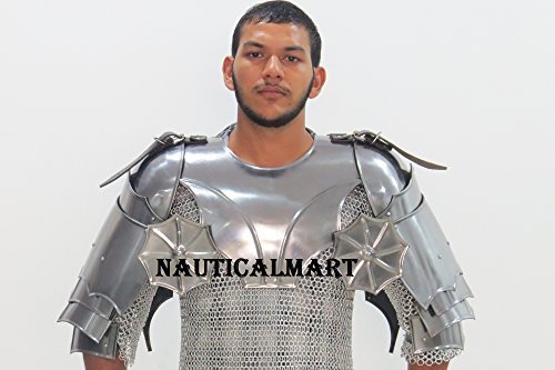 NAUTICALMART MEDIEVAL LARP ARMOR GORGET SET WITH PAULDRONS - MEDIEVAL COSTUME All three pieces of armor (the gorget and the two pauldrons) are crafted from 18 gauge steel and feature an attractive shiny metal finish that makes this armor all but gleam in the light. The pauldrons feature an impressive and outstanding LARP style that uses one large, elegantly shaped shoulder plate to protect most of the shoulder, as well as three smaller lames that extend down to protect the arm.
