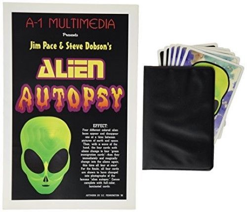 Alien Autopsy by Jim Pace Steve Dobson: Four differently colored alien faces appear and disappear one at a time between pictures of earth and space. Then, with a wave of the hand, the four cards with aliens change to four "green immigration cards" - which then magically change into the aliens again, this time all four at once! For the finale, all four cards are shown to have once again changed into photographs of the infamous "alien autopsy." Comes complete with all of the necessary, full-color cards and detailed, fully-illustrated instructions.