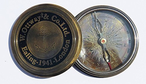 Antique Style W Ottway's Collectible Brass Compass with Leather Case - Large Poem Compass W Ottway's Collectible Brass Compass With Leather Case Robert Frost Poem Direction Compass with Leather Case Brass Pocket Compass with Removable Lid is a beautiful solid brass reproduction of an antique air-damped compass. Under the Lid poem is engraved. The high quality jeweled compass needle settles to North very quickly for timely and accurate readings. The brass cover that unthreads and retreads onto the opposite side where it functions as a holder. The Road Not Taken Two roads diverged in a yellow wood, And sorry I could not travel both And be one traveler, long I stood And looked down one as far as I could To where it bent in the undergrowth; Then took the other, as just as fair, And having perhaps the better claim Because it was grassy and wanted wear, Though as for that the passing there Had worn them really about the same, And both that morning equally lay In leaves no step had trodden black. Oh, I marked the first for another day! Yet knowing how way leads on to way I doubted if I should ever come back. I shall be telling this with a sigh Somewhere ages and ages hence: Two roads diverged in a wood, and I, I took the one less traveled by, And that has made all the difference. Approximate Size:- 8cm - Dia x 2cm - Thick (Compass) 9cm - L x 8.5cm - W (Case)
