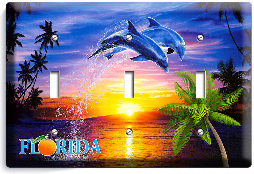 FLORIDA PALMS OCEAN DOLPHINS SUNSET TRIPLE LIGHT SWITCH WALL PLATE FL ROOM DECOR