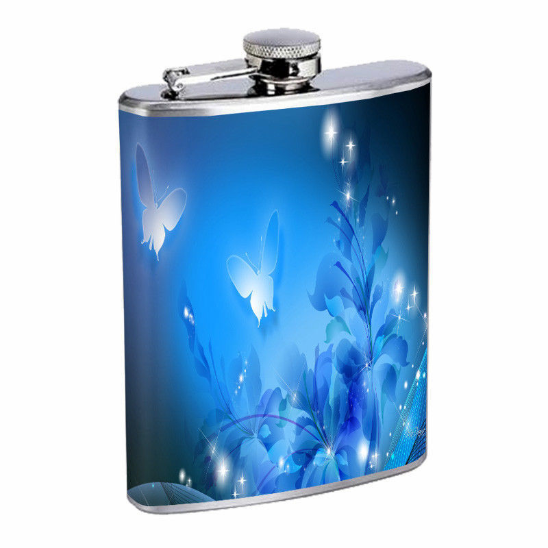 Blue Butterfly Flower Em1 Flask 8oz Stainless Steel Hip Drinking Whiskey
