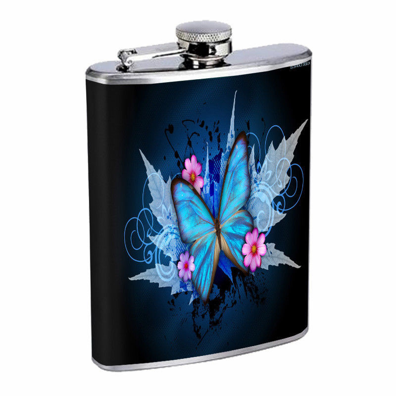 Blue Butterfly Flower Em2 Flask 8oz Stainless Steel Hip Drinking Whiskey