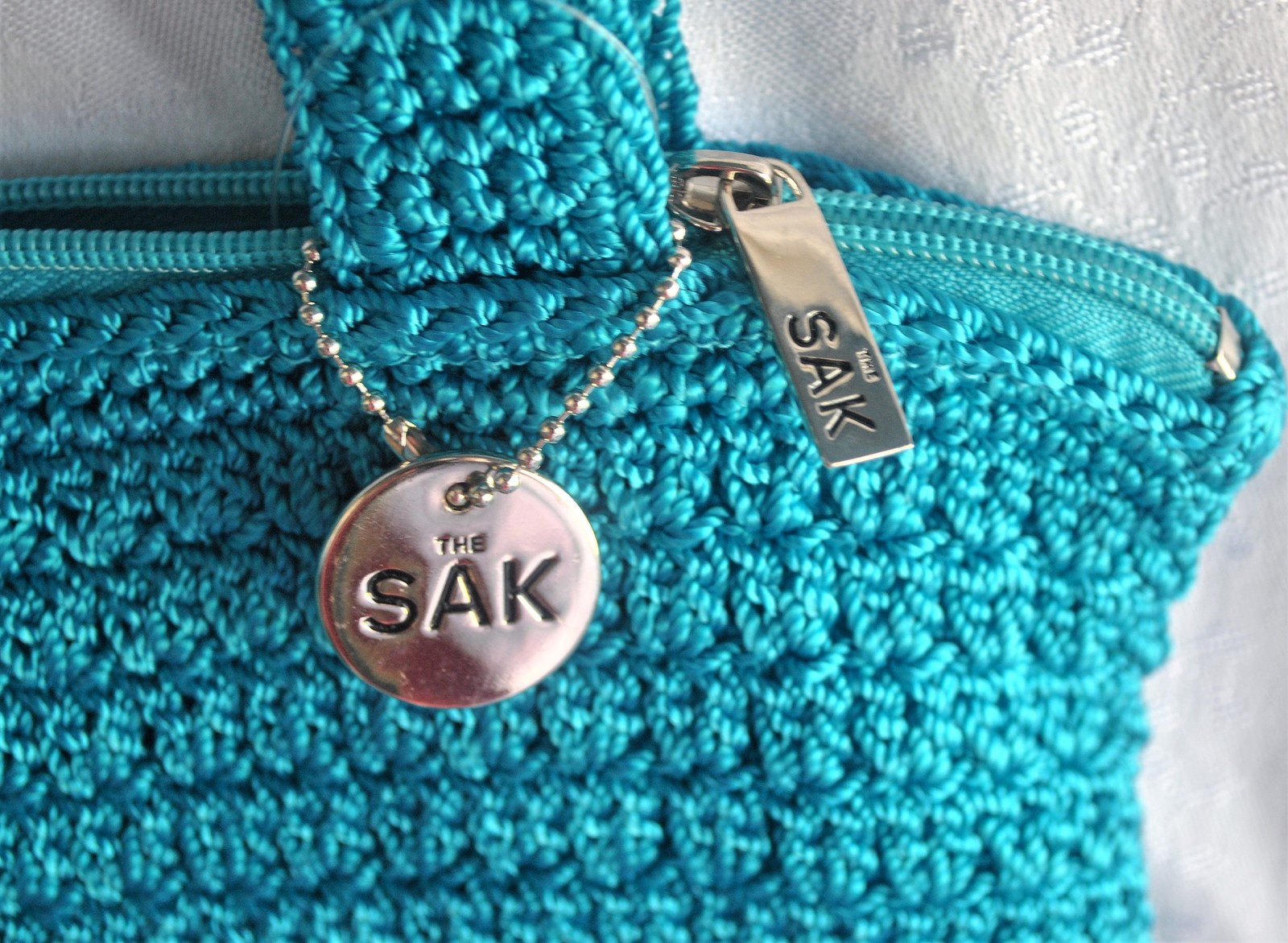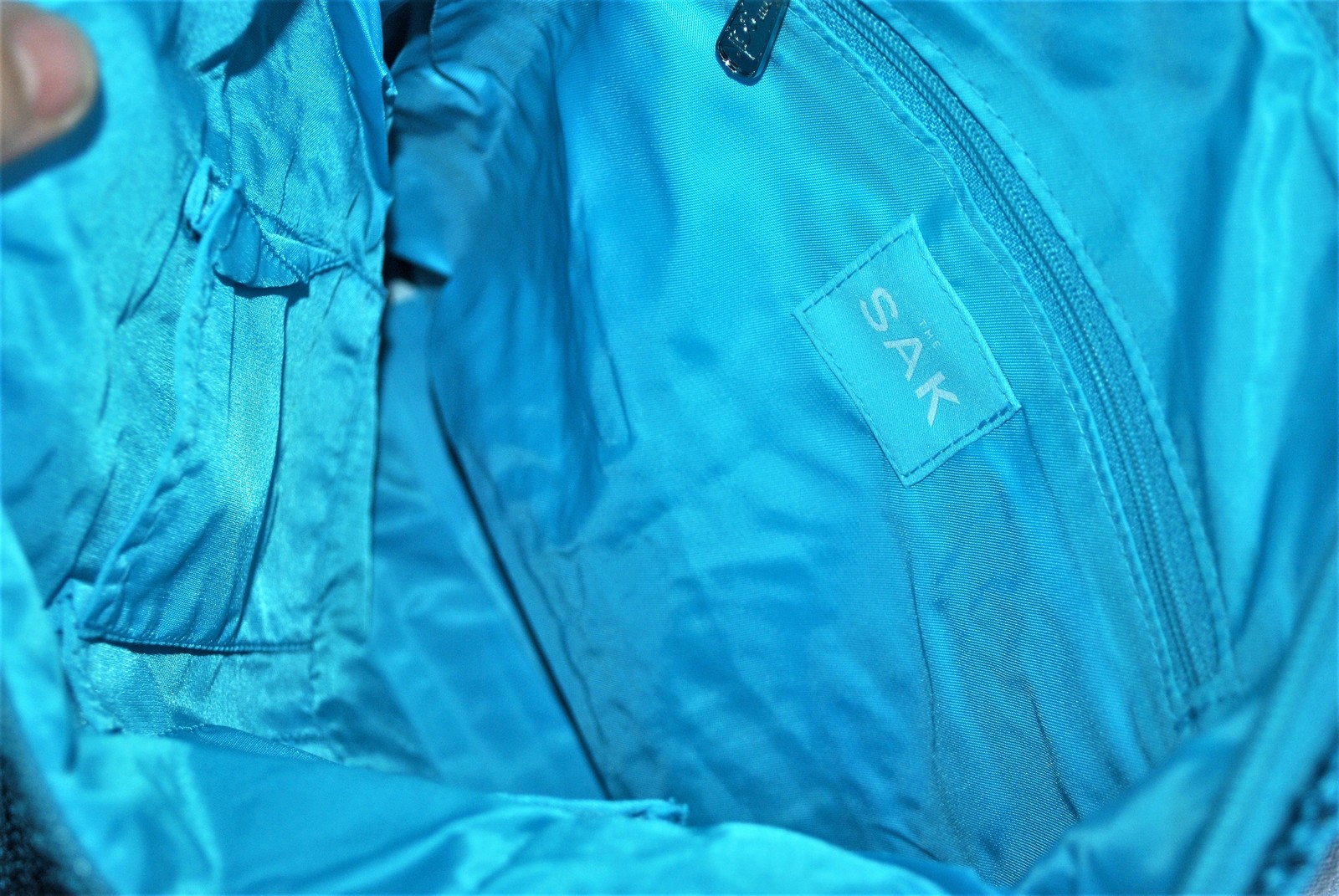 Brand new, as shown. Beautiful shoulder bag with zippered main closure as well as a zippered interior pocket. There are also two, cell phone sized interior pockets with a pen pocket in between them. The bag is made of polypropolene for durable wear and the interior is nylon. The bag also has "The Sak" logo charm and "The Sak" impressed on the zipper. All findings are silvertone.