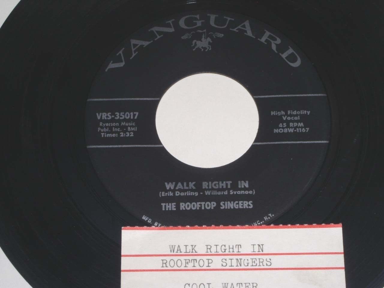 This is a vintage 45 rpm phonograph record by The Rooftop Singers, entitled, "Walk Right In". Flipside: "Cool Water". Record label: Vanguard VRS-35017. Comes with the original juke box strip, making this all the nicer.