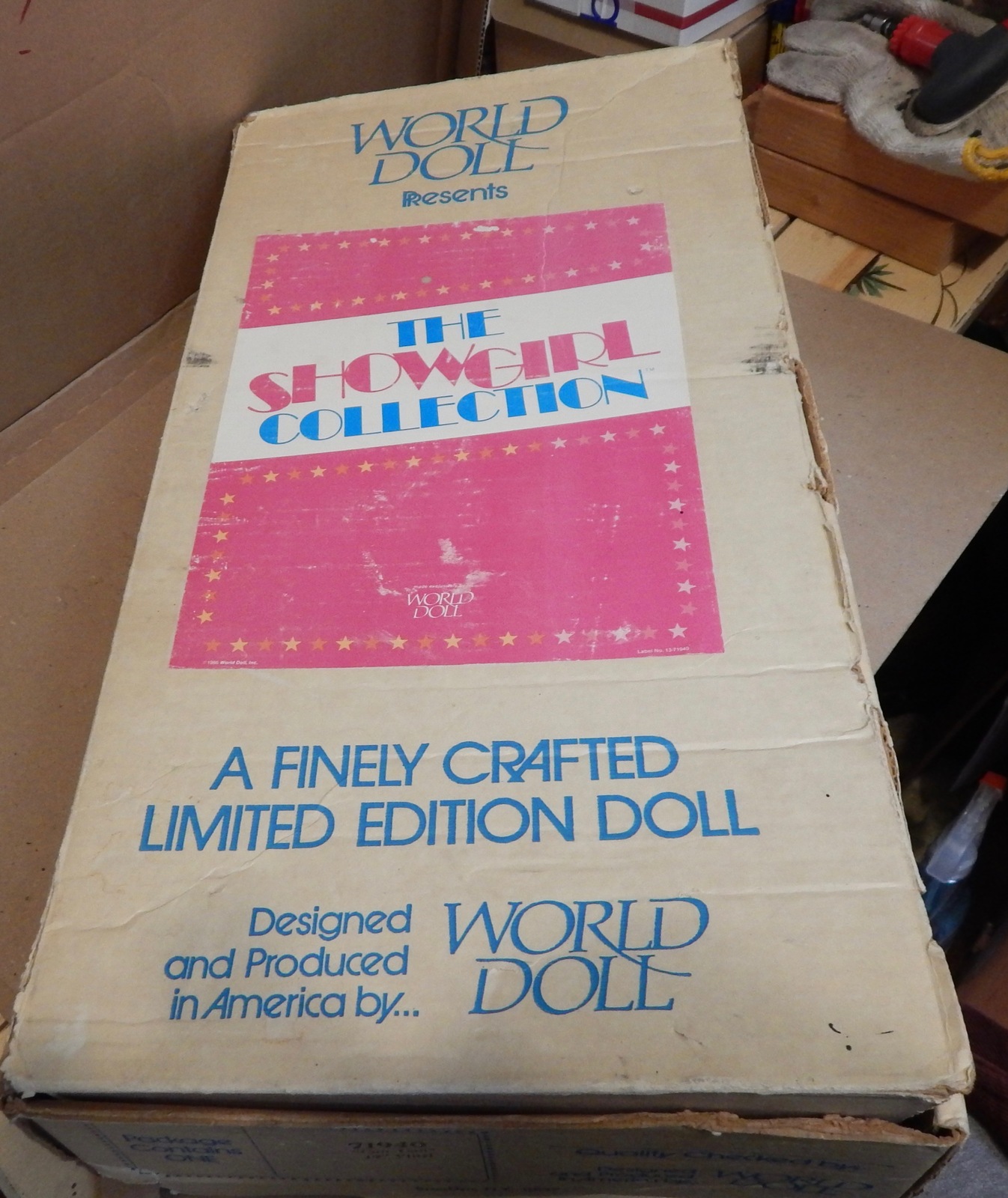 Can Can Showgirl in box with wrist tag and certificate. Made of all jointed vinyl with painted facial features. First in the Showgirl Collection. Box is in ok condition. Item # 1R-83 ABSOLUTELY BEAUTIFUL !!! The doll is marked World Doll on the back of her head. She measures 19 inches tall with red hair.