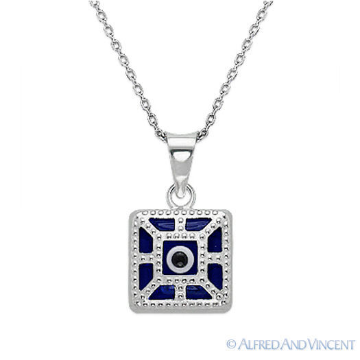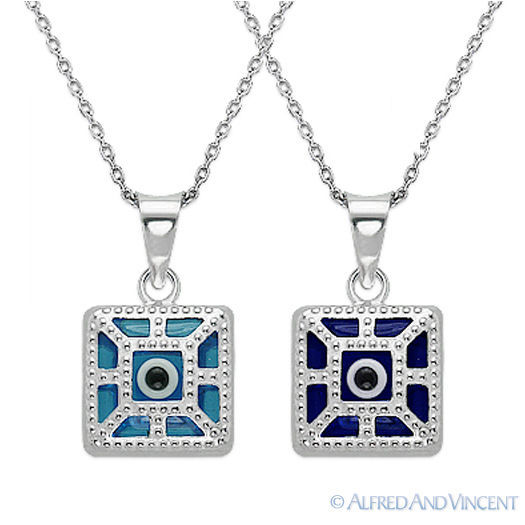 Each 2-sided pendant is cast in .925 sterling silver and showcases an evil eye glass bead encased in a textured reversible square design. Each pendant then dangles from a 925 sterling silver chain to dangle it nicely around your neck.