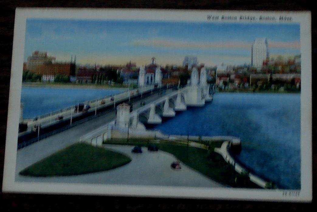 West Boston Bridge, Boston Massachusetts. The postcard is in good condition, with some light wear at the corners and edges, and some light stains and yellowing on the back and front. The discoloration in the photo is a reflection, and is not any discoloration actually on the postcard. There is some yellowing on the back on this card, and some staining on the front of this card as well. The postcard is un-used postally, and has a caption on the back that reads; West Boston Bridge, Boston. Bridging the Charles River, connecting Boston and Cambridge. A beautiful granite structure, over which pass some of the cars to Cambridge, the home of Harvard UniversityโฆIt is 3.5โ by 5.5โ and is a nice color tone lithograph postcard.