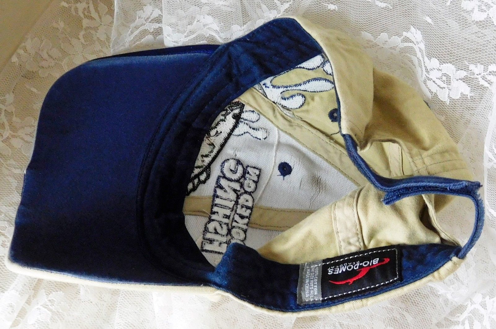 Bio-Domes Headgear "Hooked on Fishing" Embroidered Baseball Cap Hook Loop Closure. There is a small stain on the left front edge of bill, otherwise in very good condition - See photos for further description.