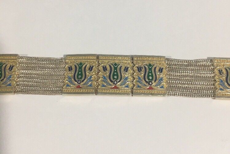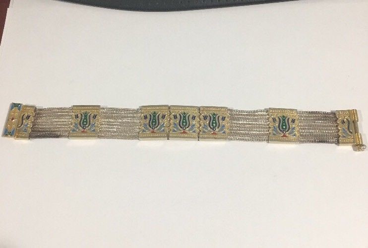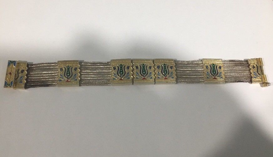 Here we have a beautiful sterling silver vintage bracelet with colorful enamel. Total weight: 52.7g. Length: 7 inches. Width: 19mm. The perfect gift for your loved one. Comes with a pin lock that you pull to open bracelet. Comes with a free gift box. Item is pre-owned and will show normal wear, but in great shape. Thanks for looking and have a great day.