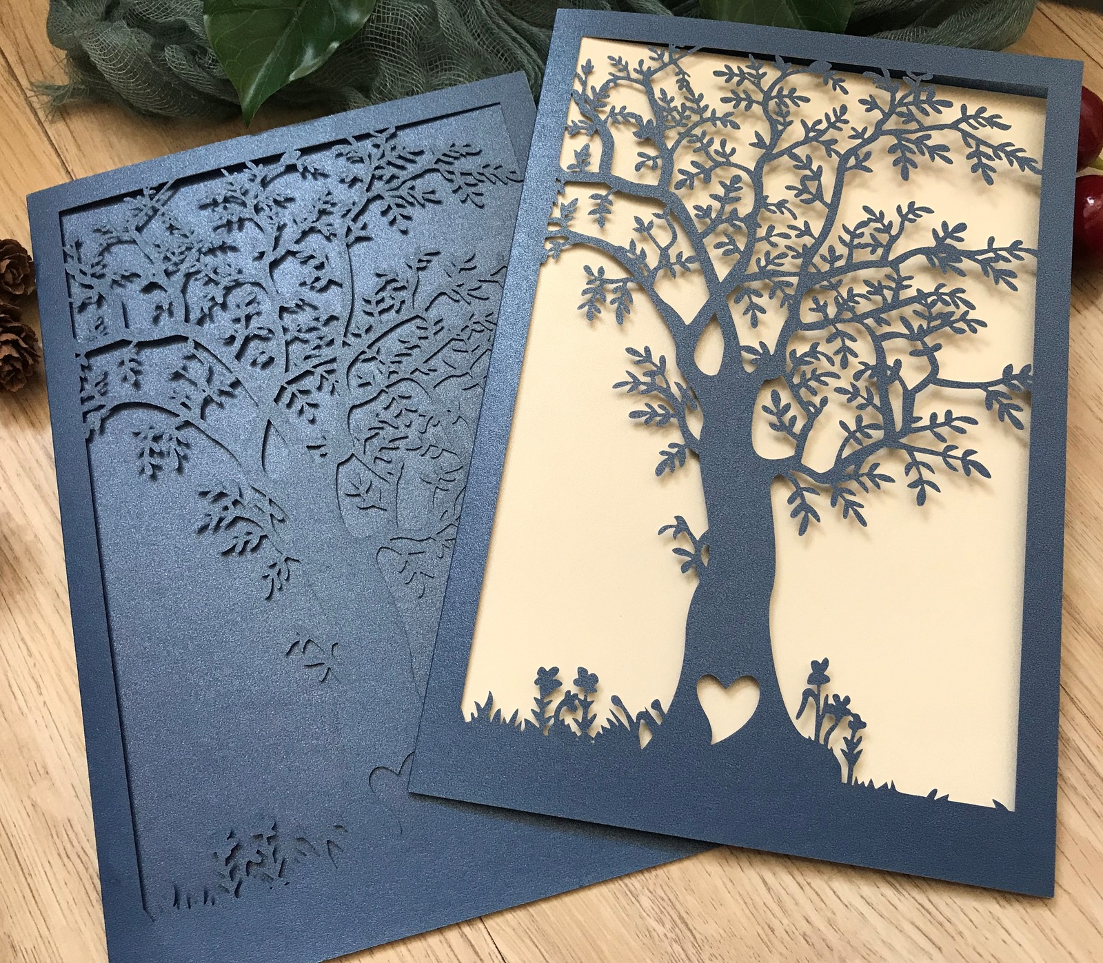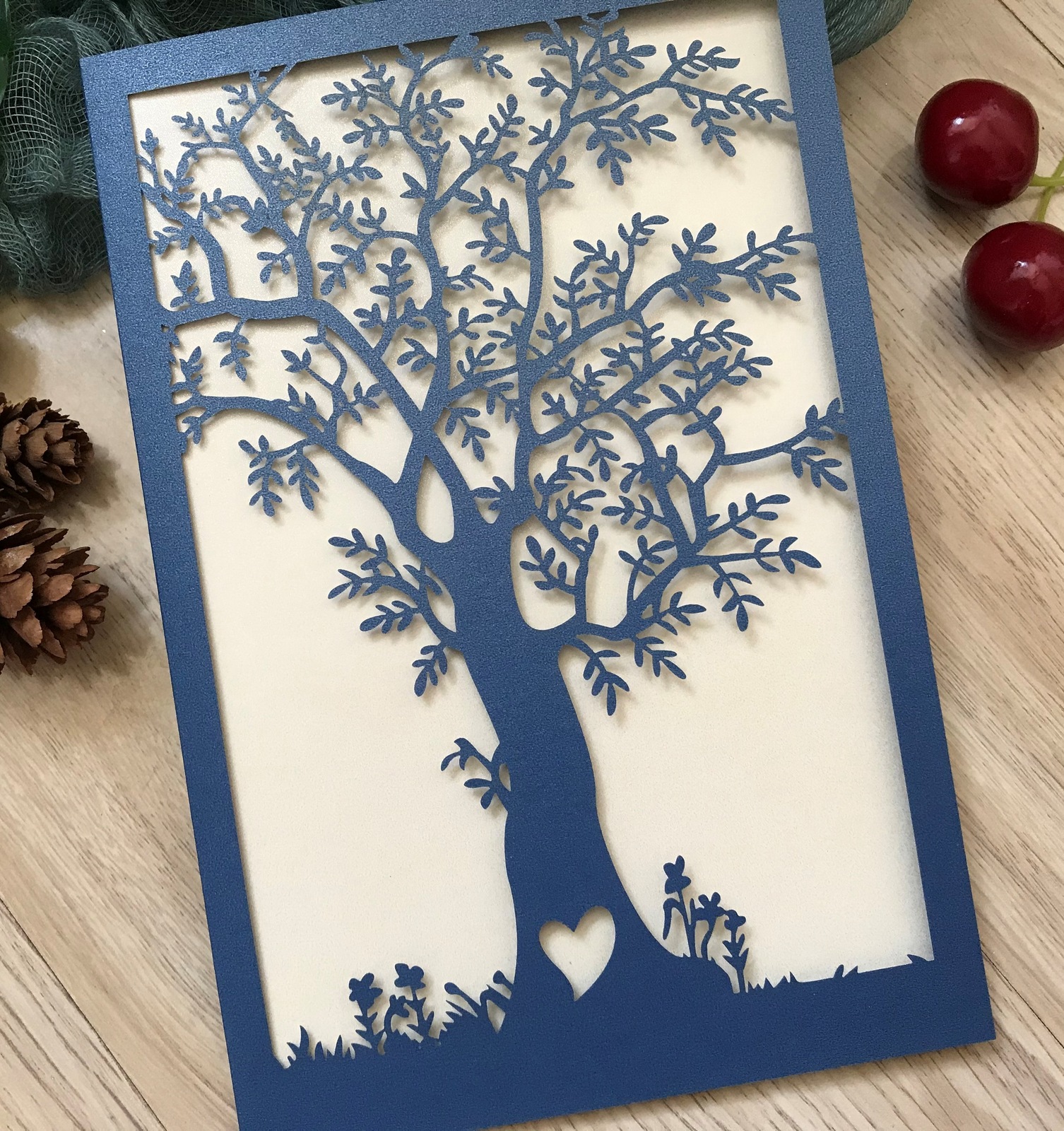 50pcs Free Shipping Pearl Navy Blue Tree Laser Cutting Invitation Cards,Lace Blank Birthday Greeting Cards,Wedding Invitation,Engagment Cards