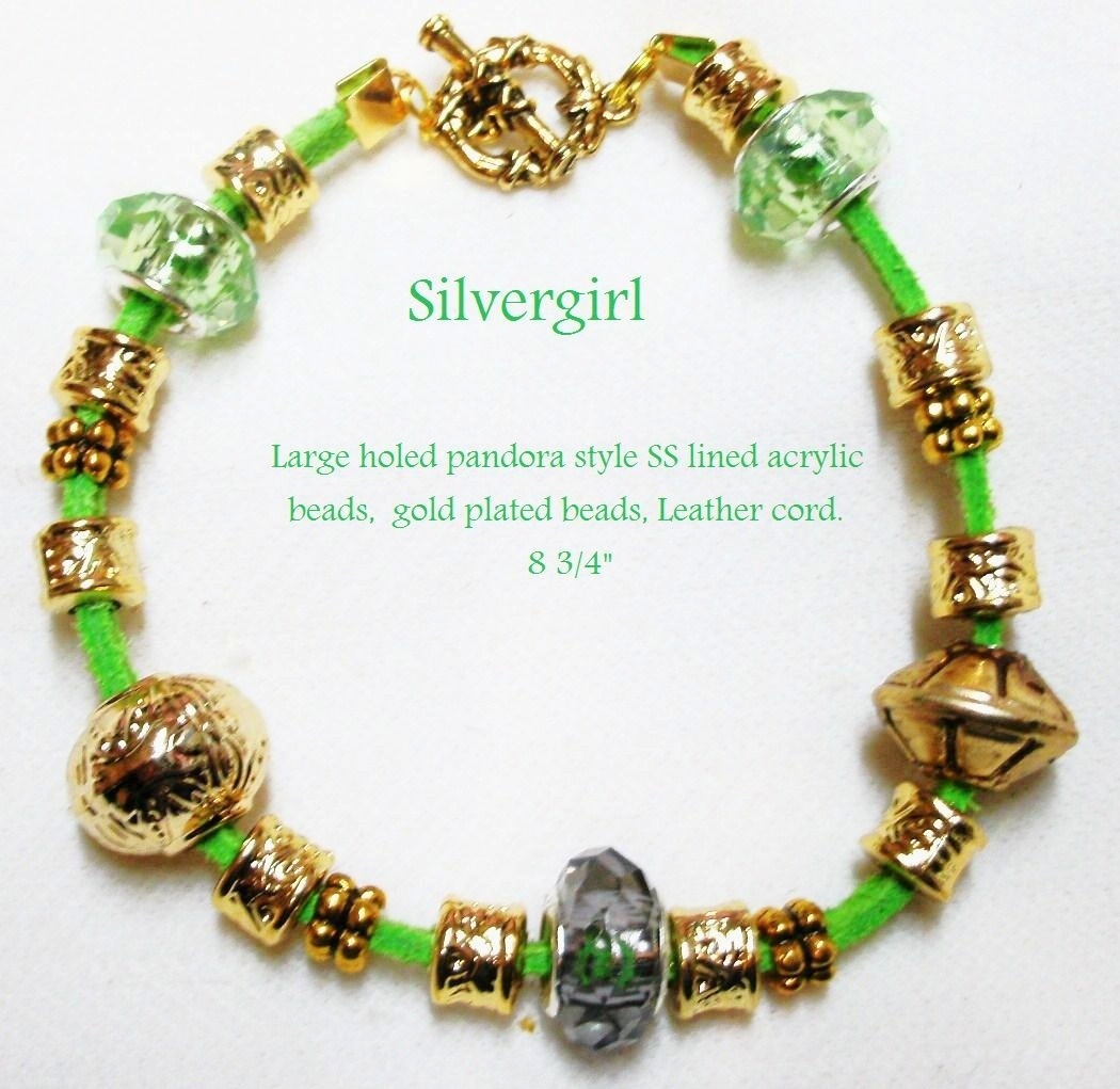 I have made these bracelets with some European Style Large holed SS beads. Some are glass and some acrylic but look like glass.