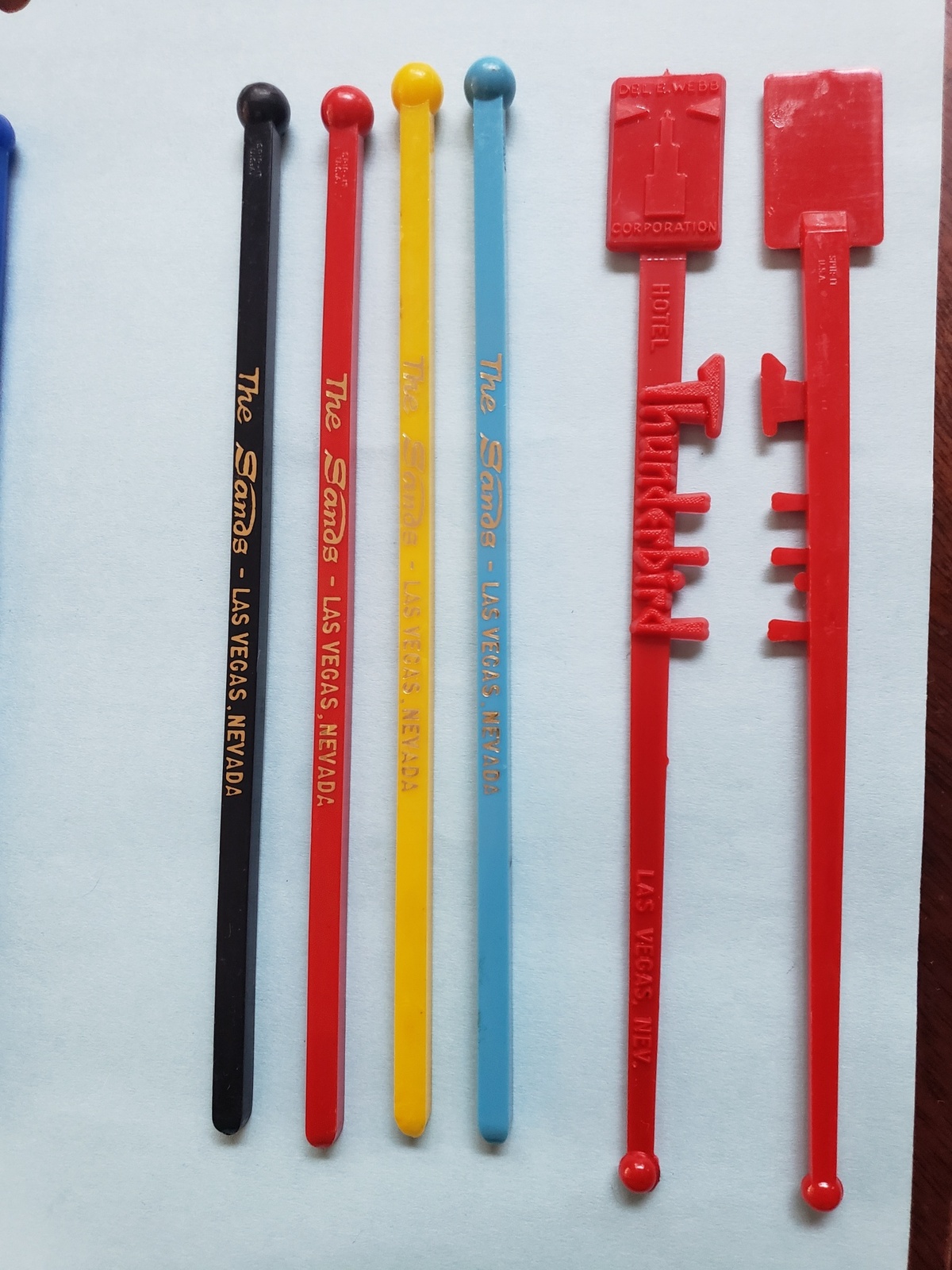 This is a set of 2 original swizzle sticks from The Thunderbird Hotel, Las Vegas, Nevada, a Dell E Webb Corporation property.
