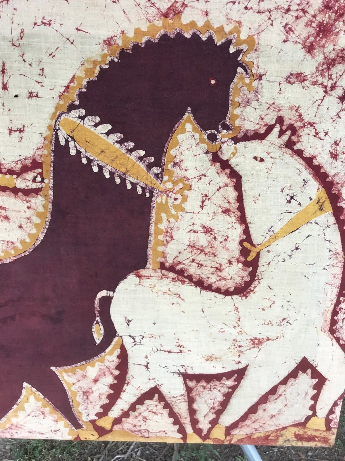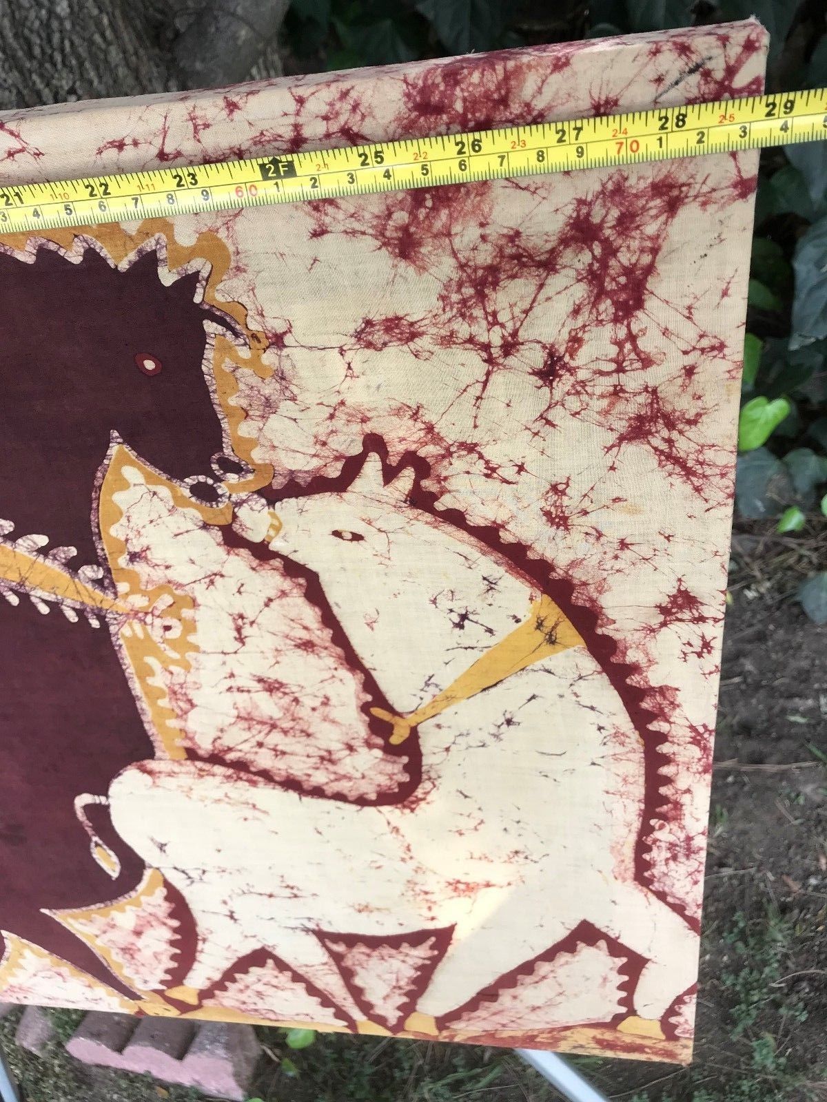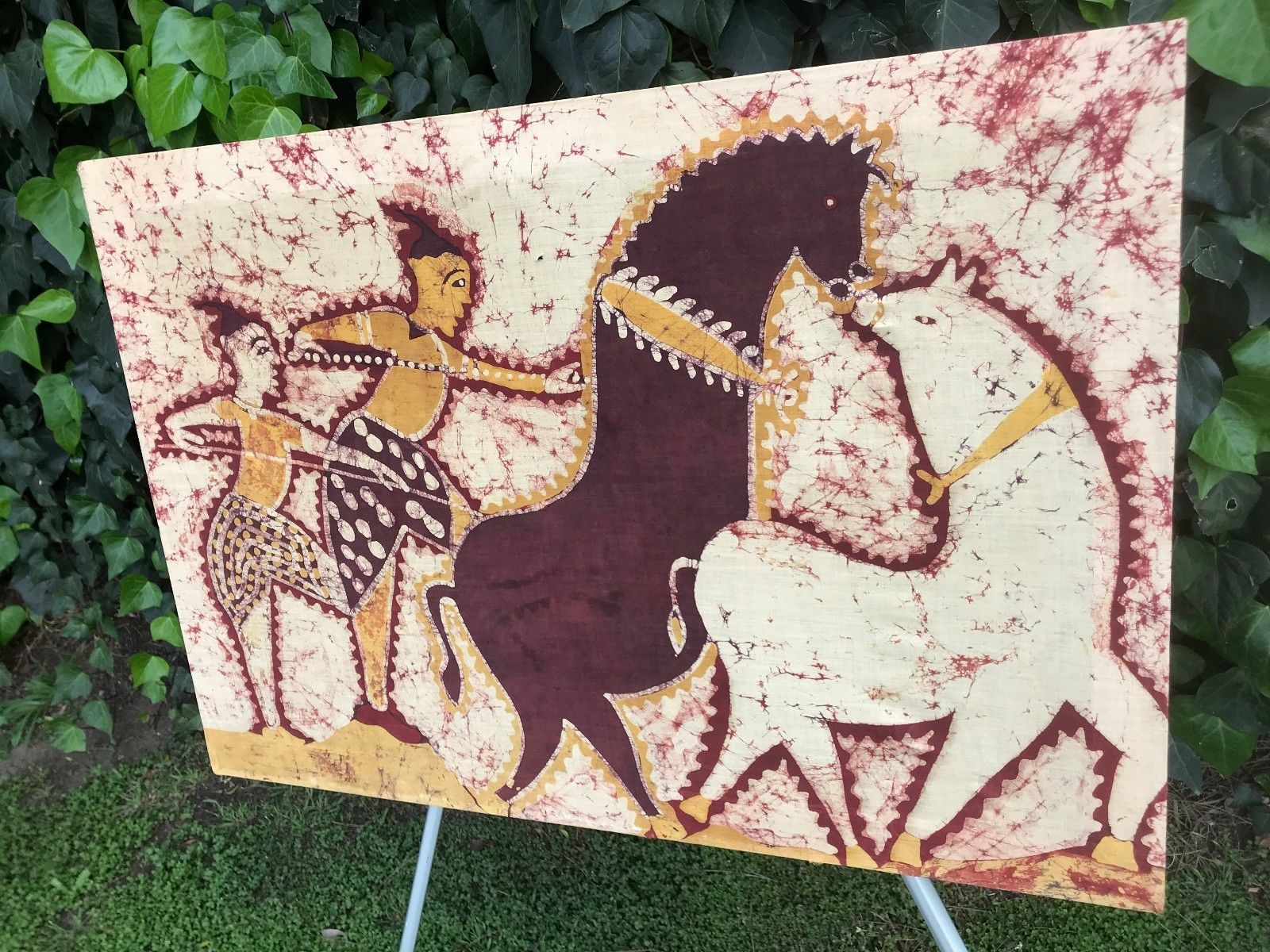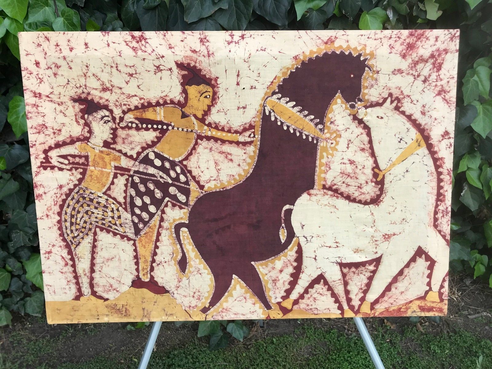 VINTAGE BALI BATIK Original MODERN PRIMITIVE Men Horse Cave Art Fabric Painting
