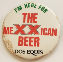 This is a vintage I'm Here For The MeXXican Beer Dos Equis 2-1/4" pinback button in great condition. Some discoloration on back.