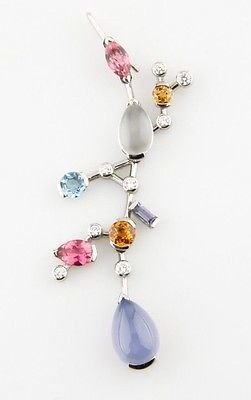 El diseño incorpora turmalina rosa, aguamarina, iolite, granate, ónix y moonstone con detalle de diamante talla brillante.