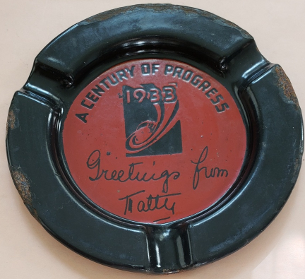 A vintage souvenir ashtray with personalized greeting from the Chicago World's Fair, 1833-1933 A Century of Progress.