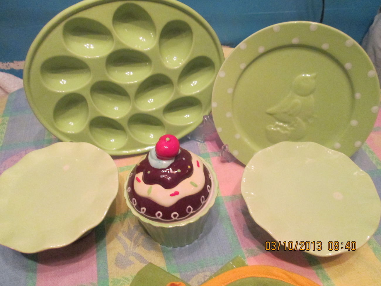 Enjoy this burst of spring with this little combo from the BOUTIQUE. Beautiful Sage Green ensemble includes : 1 - 10" Ceramic egg platter holds 12 eggs, 2 ceramic scalloped pedestal