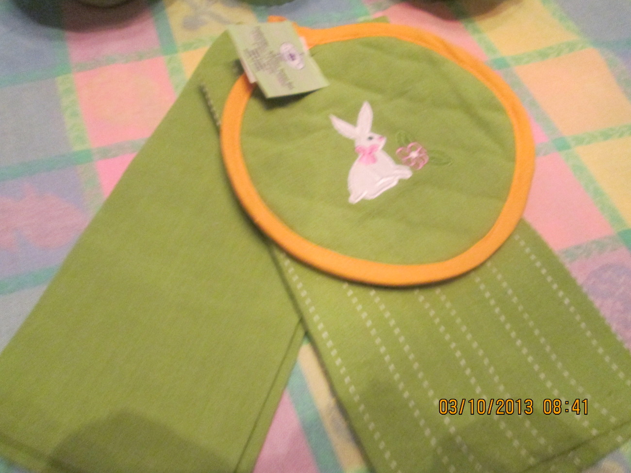 titbit stand 6"x3", 1 cotton 3 piece kitchen/ guest towel set includes 1 round pot holder with bunny embroidery 8 1/4" diameter, 2 kitchen guest towels 25" x 16", 1 ceramic dessert/titbit plate 8" chicken hatched, 1 - 6"x 4" ceramic cupcake dessert ice cream cup with cherry top lid. Tablecloth Not included in this package