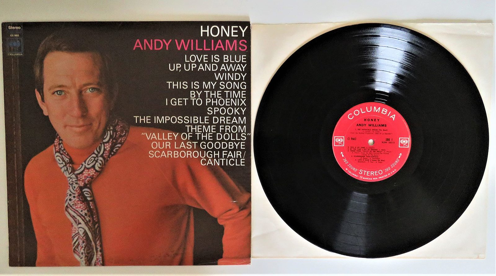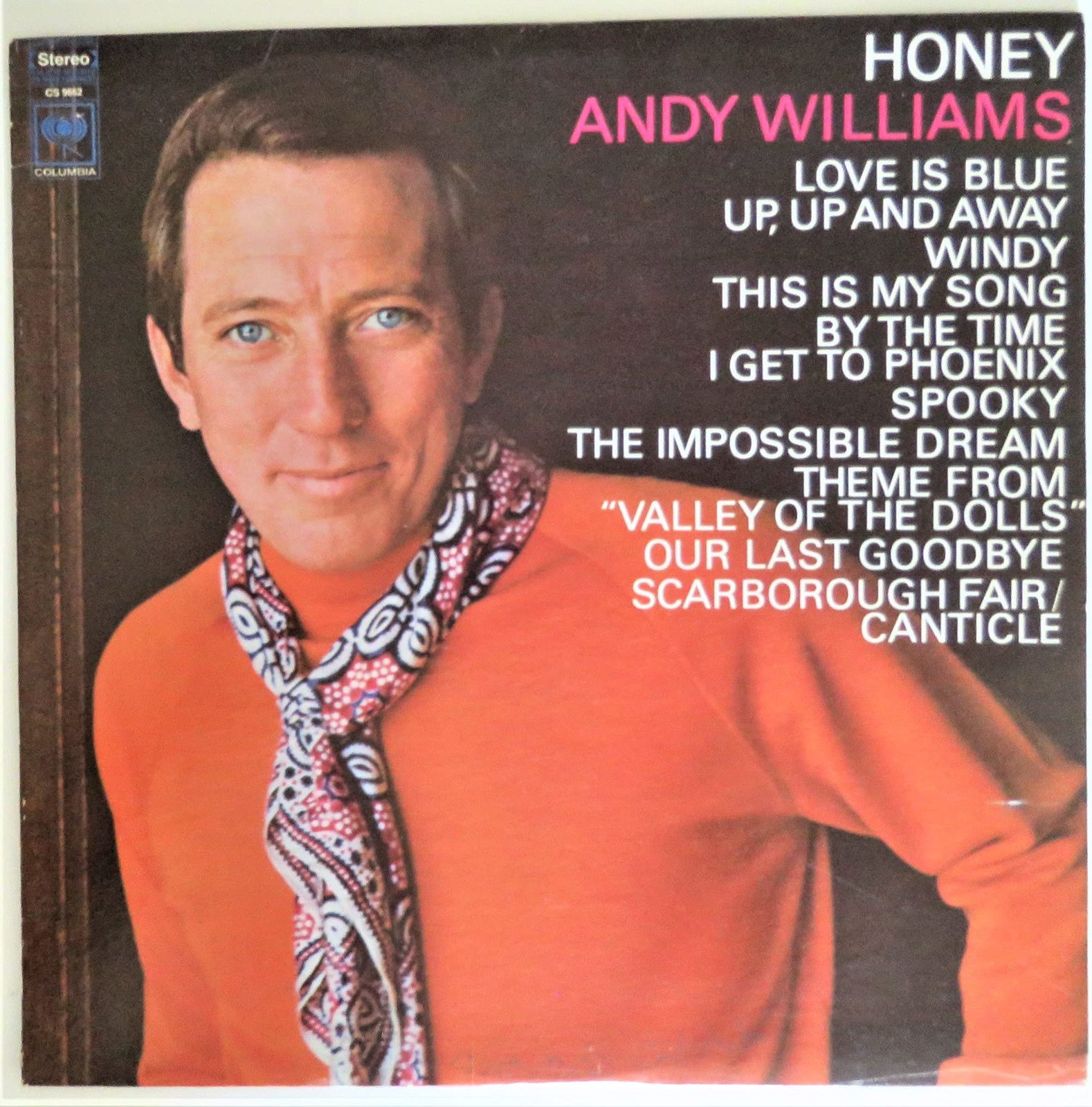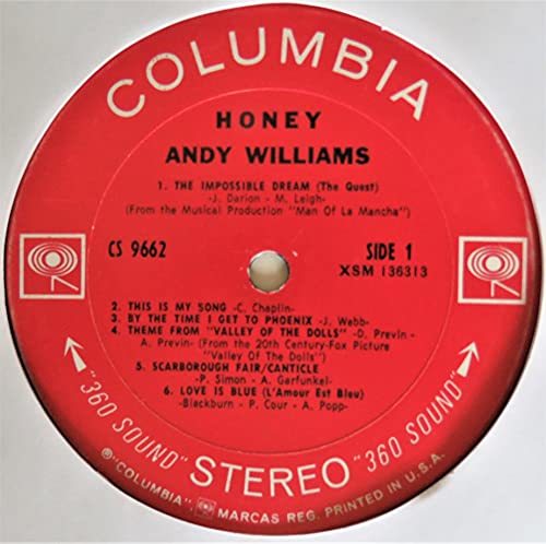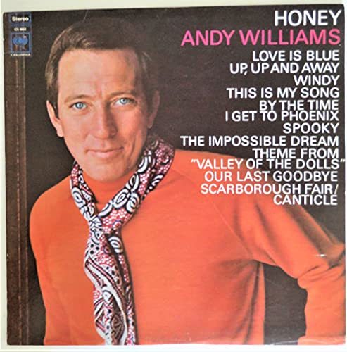 Product description: Andy Williams' 22nd studio album "Honey" peaked @ #9 was certified Gold. 1968 Columbia 12" vinyl stereo LP record plain once-white inner paper sleeve in an outer jacket. Track. "Title" (songwriter) length: A1. "The Impossible Dream (The Quest)" from Man of La Mancha (Joe Darion, Mitch Leigh) ? 2:39; A2. "This Is My Song" (Charles Chaplin) ? 2:53; A3. "By the Time I Get to Phoenix" (Jimmy Webb) ? 3:49; A4. "(Theme from) Valley of the Dolls" from Valley of the Dolls (Andre Previn, Dory Previn) ? 3:40; A5. "Scarborough Fair/Canticle" (Art Garfunkel, Paul Simon) ? 3:46; A6. "Love Is Blue (L'Amour Est Bleu)" (Brian Blackburn, Pierre Cour, Andre Popp) ? 2:46; B1. "Honey (I Miss You)" (Bobby Russell) ? 4:30; B2. "Windy" (Ruthann Friedman) ? 2:25; B3. "Our Last Goodbye" (Nick DeCaro, William "Ju Ju" House) ? 2:25; B4. "Spooky" (Buddy Buie, James B. Cobb, Jr., Harry Middlebrooks, Mike Shapiro) ? 3:18; B5. "Up, Up and Away" (Jimmy Webb) ? 2:36.