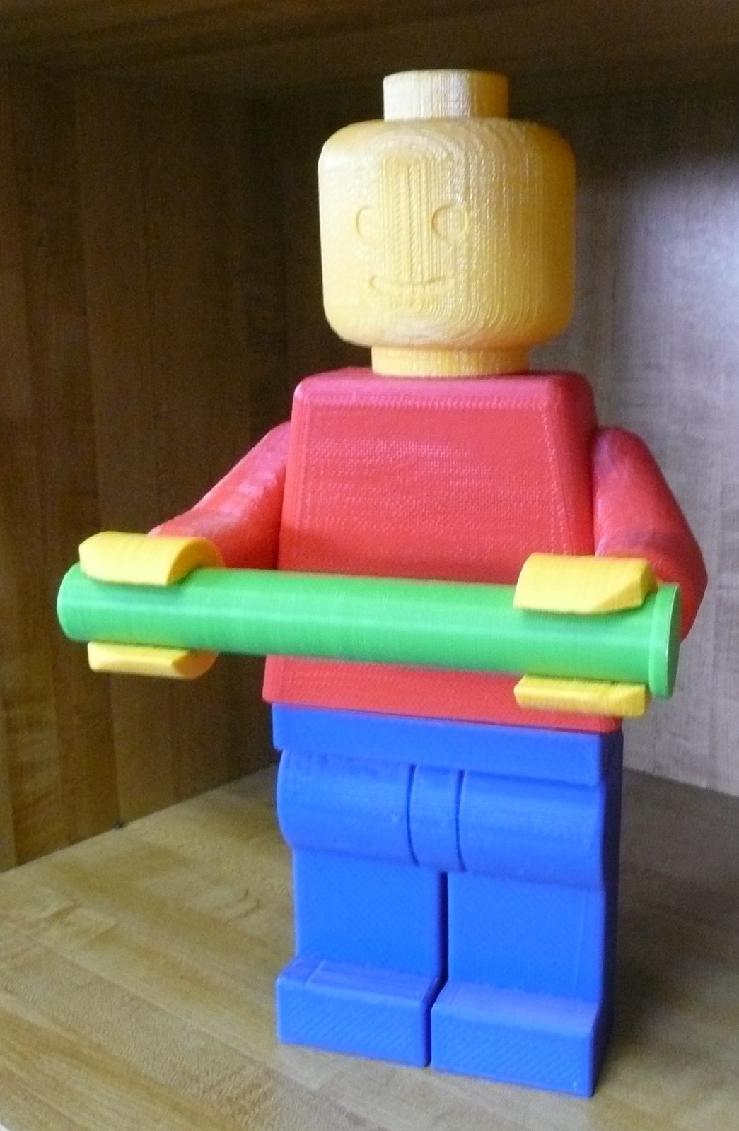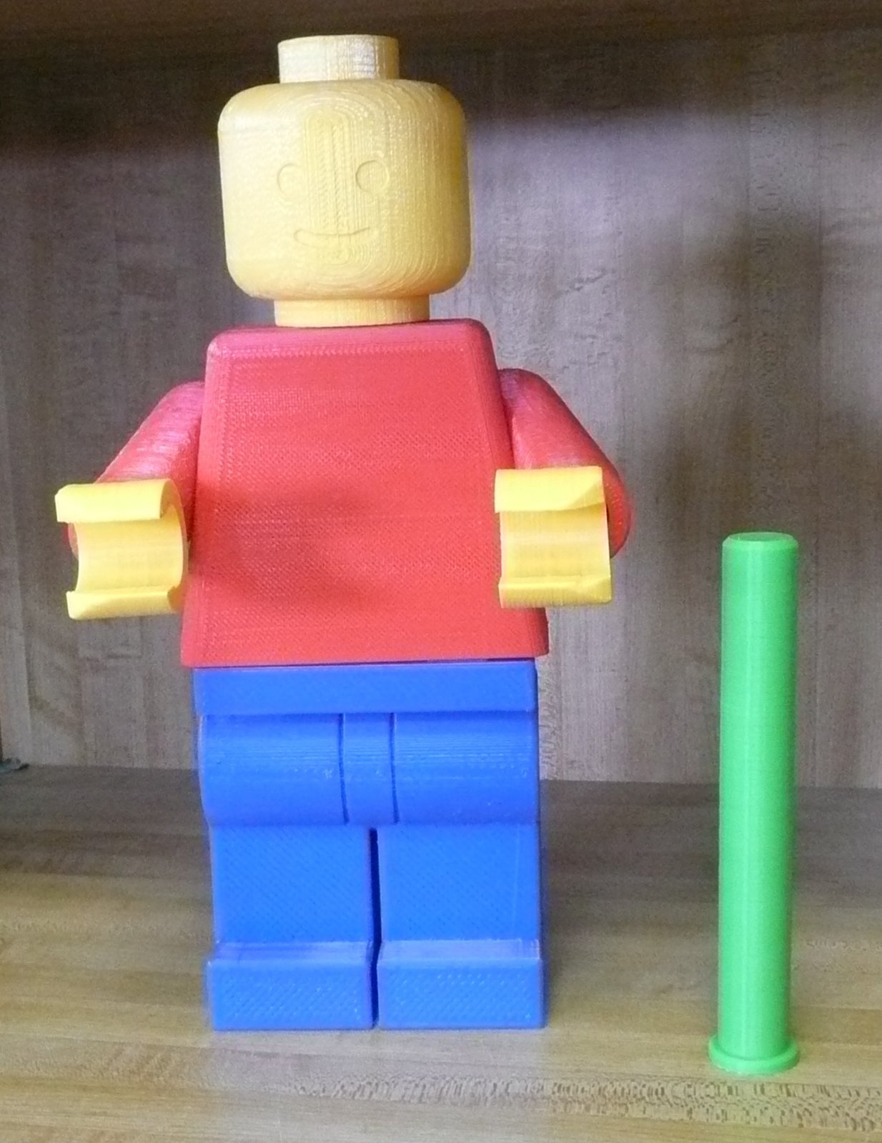 You will receive one yellow lego man head, 2 yellow lego man hands, 1 red lego man body, 1 blue lego man legs, and 1 green toilet paper holder.