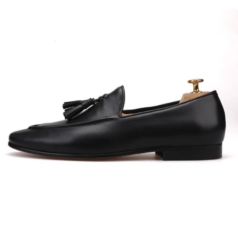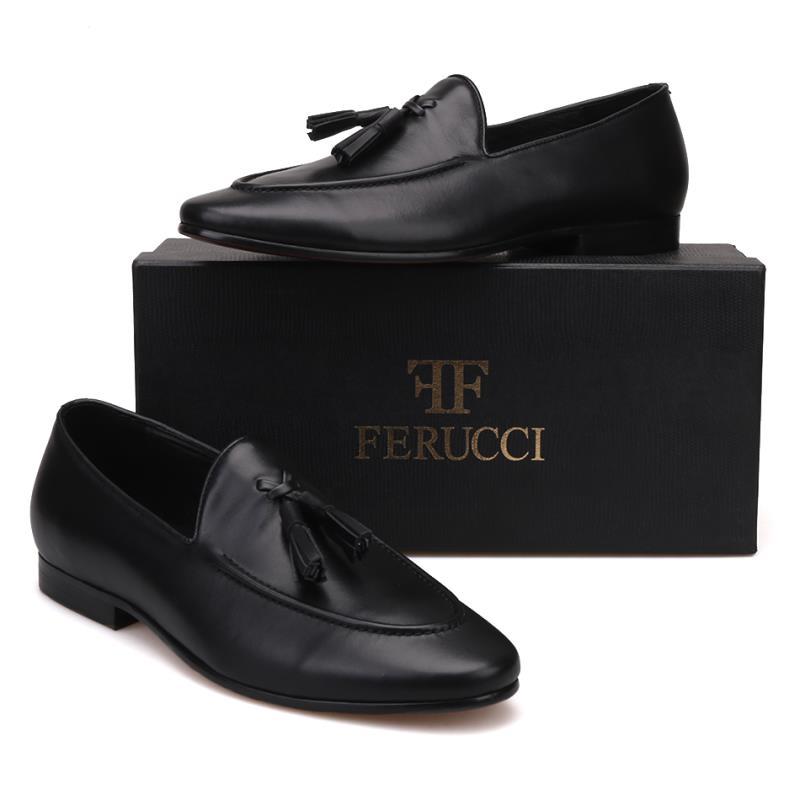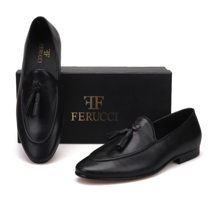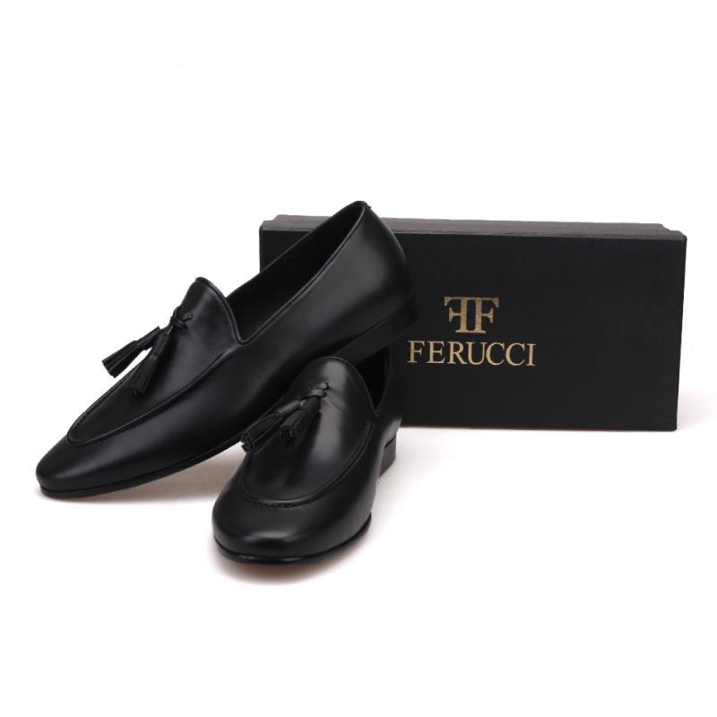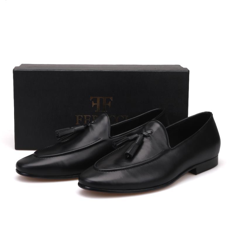 Handmade FERUCCI Men Plain Black Leather with Black Tassel Slippers loafer