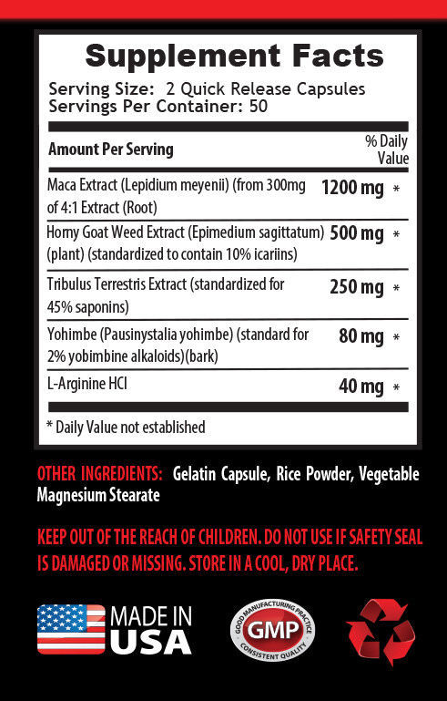 WARNING: This product contains yohimbine, which may cause an elevation in blood pressure and heart rate, and should not be taken by people with cardiorenal diseases, ulcers, or hypersensitivity to any component. If you are pregnant, nursing or taking any medications, consult your doctor before use. If any adverse reactions occur, immediately stop using this product and consult your doctor. If seal under cap is damaged or missing, do not use. Keep out of reach of children. Store in a cool, dry place.