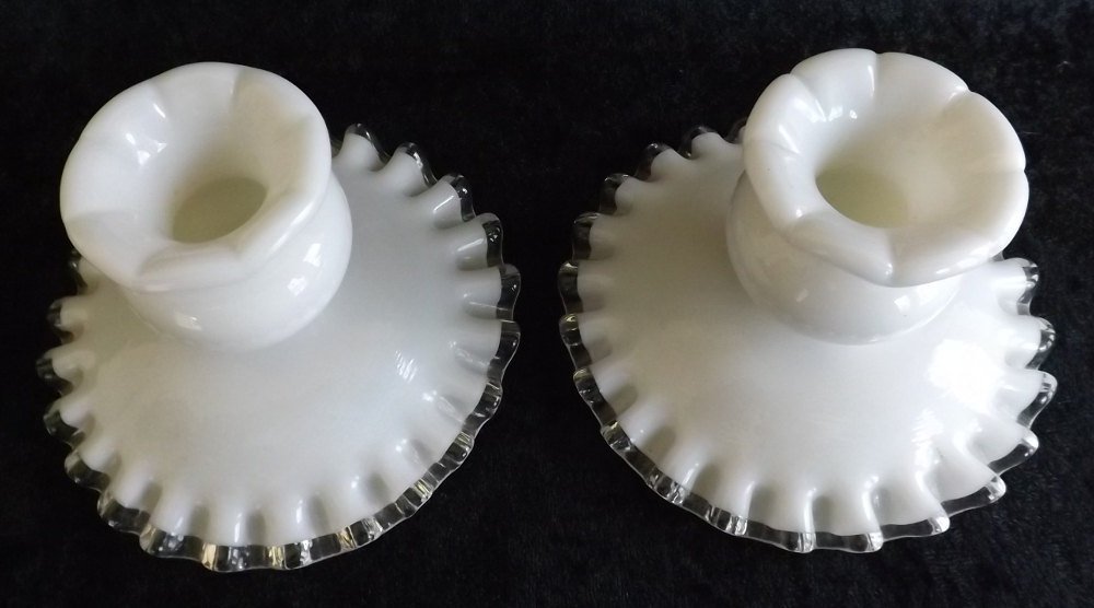 Matching pair of Fenton art glass candle holders in milk white glass with silver crest lace. Candle holders measure 3-1/4" tall with a 2-1/2" base. Features Fenton's famous ruffled clear crest around the bottom edges.