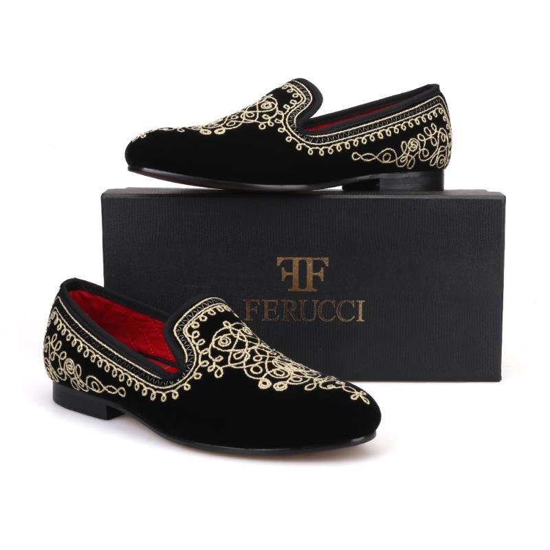FERUCCI Men Black Velvet with Gold Embroidered Threads Slippers loafers Flats