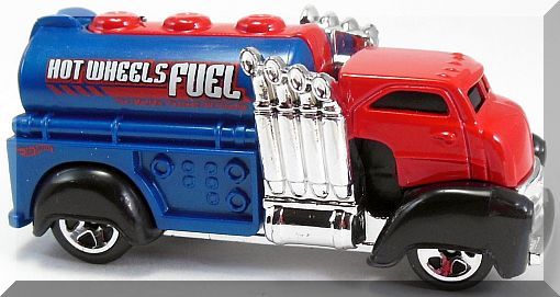 Description: Red, w/No interior, Blackout windows, Dark Blue tank, Red ‘Hot Wheels’ logo on rear sides, Red Black ‘Hot Wheels Fuel’ ‘The World's Fastest Oil Supply’ on sides of tank, Chrome Malaysia base, w/Chr5SP’s. 081118-081118P-D08