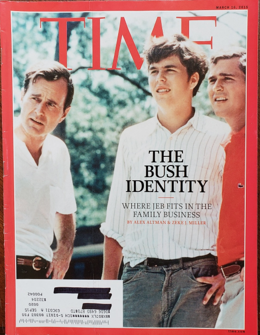 Time Magazine March 16, 2015 features on cover, George H. W. Bush, Jeb and George W. in 1970.