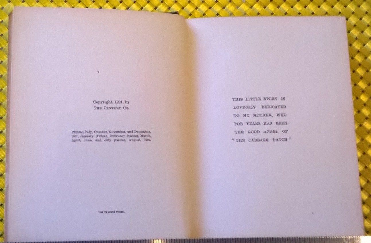Copyright 1901 by The Century Co., printed by the De Vinne Press. This copy from the 1st edition, but stated from 14th printing in August, 1902 (1st printing was in July, 1901). Tremendous sales reception to have an average of more than one print-run per month in the 1st 13 months of issue. No ISBN, LCCN nor MSR.