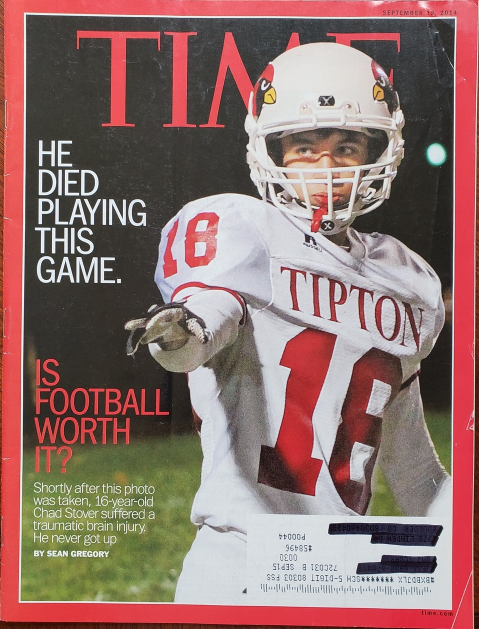 Time Magazine September 29, 2014 features on cover, 16 year old Chad Stover - He died playing this game. Is Football worth it?