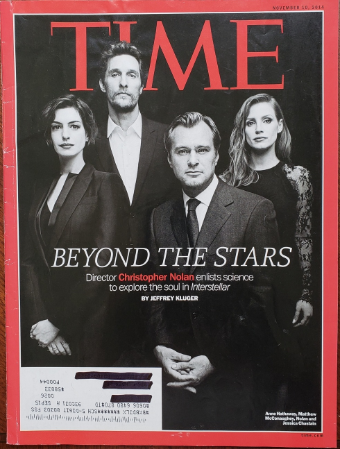 Time Magazine November 10, 2014 features on cover, Beyond The Stars - director Christopher Nolan enlists science to explore the soul in Interstellar.