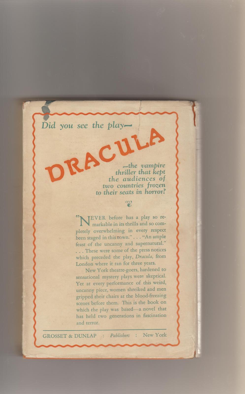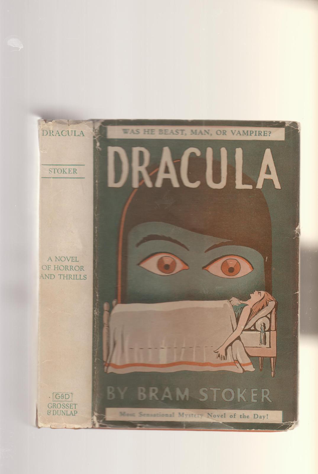 DRACULA by Bram Stoker Grosset Dunlap, Play Edition, 1928 Condition: Near Very Good in VG- dust jacket One of THE classic horror novels, DRACULA was first published in 1897. Thirty years later, it was adapted as a play and began its eight-month run on Broadway, with Bela Lugosi as the Count. During that run, this edition of DRACULA was published, with an endorsement of the play on the back cover of the dust jacket. It was another three years before the Lugosi movie version gave the story its greatest fame to date. This play edition is especially noted for the "large eyes staring over the sleeping woman" jacket cover (another reason why the presence of the dj is so important for the collector). An ad at the back lists 14 detective books by J. S. Fletcher.