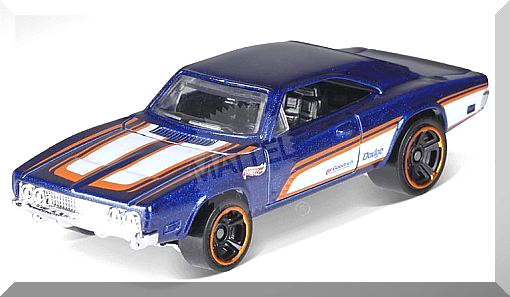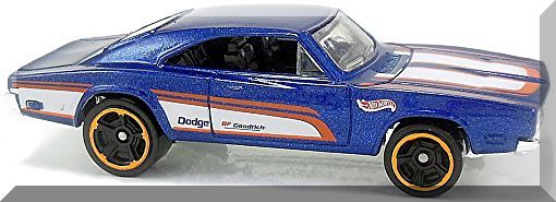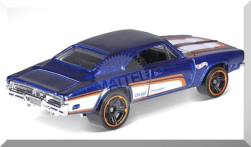 Description: Mtlflk Blue, w/Black interior, Clear windows, Orange White racing stripes on hood, Orange White stripe graphics on sides, Black ‘Dodge’ on sides, Small Red Blue ‘BF Goodrich’ logo on doors, Red White ‘Hot Wheels’ logo on front fenders. 081718-081718P-D09