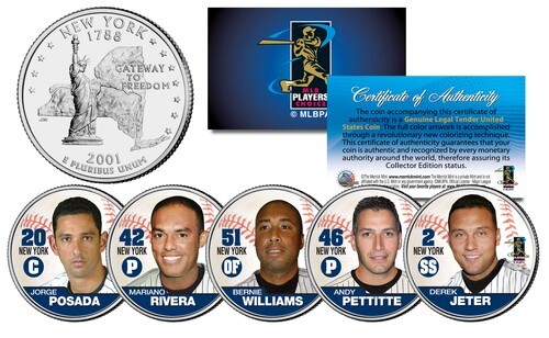 Here is your chance to own a complete set of five (5) 24KT Gold Plated and colorized 2001 New York Statehood Quarters U.S. Coins featuring the NEW YORK YANKEES GREATEST CAPTAINS, in this Limited Edition Coin Series. The 5-coin set includes: Lou Gehrig, Thurman Munson, Don Mattingly, Derek Jeter, plus a reverse colorized NY State quarter. These high-quality, genuine Legal Tender United States coins have been layered in Genuine 24 Karat Gold, and then colorized using a unique painstaking multicolor authentic process by the Merrick Mint. Colorizing coins involves the unique application of special inks directly to the surface of a coin that achieves a level of detail, color saturation, and durability that is #1 in the coin industry. The result is an everlasting colorized coin collectible of ultra-high quality. Each 24KT Gold Plated coin features an emblematic design of New York state on the reverse and portrait of George Washington design on the obverse. Coins come displayed on a die-cut display with beautiful artwork sealed in a 4? x 6? acrylic airtight case.