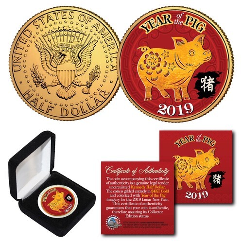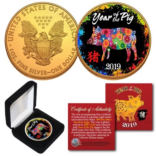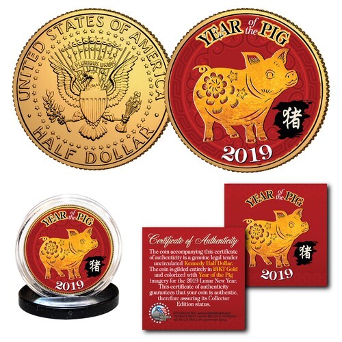 This CHINESE NEW YEAR 2019 ? YEAR OF THE PIG COIN is lucky money and a treasured collectible. Here is your chance to own or gift a beautifully colorized famous YEAR OF THE PIG 24KT Gold Plated American Buffalo Indian Tribute Coin. This high-quality coin has been layered in Genuine 24 Karat Gold, and then enhanced with beautiful colorized images using a unique painstaking multicolor authentic process. Colorizing coins involves the unique application of special inks directly to the surface of a coin that achieves a level of detail, color saturation, and durability that is #1 in the coin industry. The result is an everlasting colorized coin collectible of ultra-high quality. Each coin comes in a premium coin capsule with a Certificate of Authenticity.