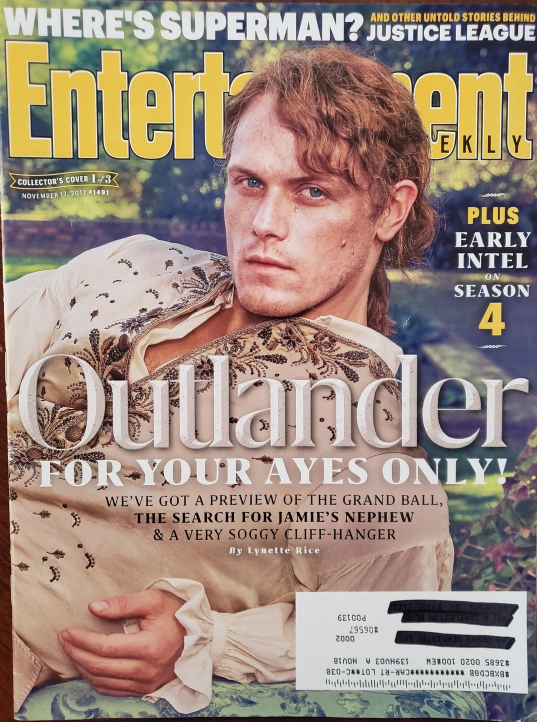 Outlander, For Your Ayes Only - Collector's Cover 1 of 3. A preview of the Grand Ballo, the Search for Jamie's nephew a very soggy cliff-hanger on cover in this November 17, 2017 issue of ENTERTAINMENT Weekly Magazine.