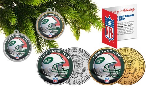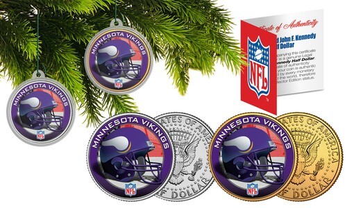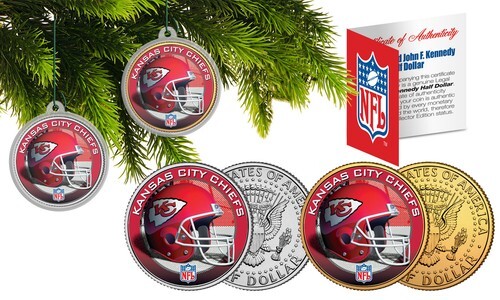 Capture the magic of Christmas with this colorized JFK Kennedy Half Dollar U.S. 2-coin set of your favorite NFL team. Each coin comes with an ornament coin capsule and Christmas tree ornament 2.5? green hanger/hook, transforming these colorized coin keepsakes into a holiday decoration to be treasured for years to come. One of the 2 coins in the set is 24KT Gold Plated. Each coin is officially licensed and approved by the National Football League (NFL). These high-quality genuine Legal Tender U.S. coins have been colorized using a unique painstaking multi-color authentic process. Colorizing coins involves the unique application of special inks directly to the surface of a coin that achieves a level of detail, color saturation, and durability that is #1 in the coin industry. The result is an everlasting colorized coin collectible of ultra-high quality. Each 2-coin set comes with a full color NFL Certificate of Authenticity.