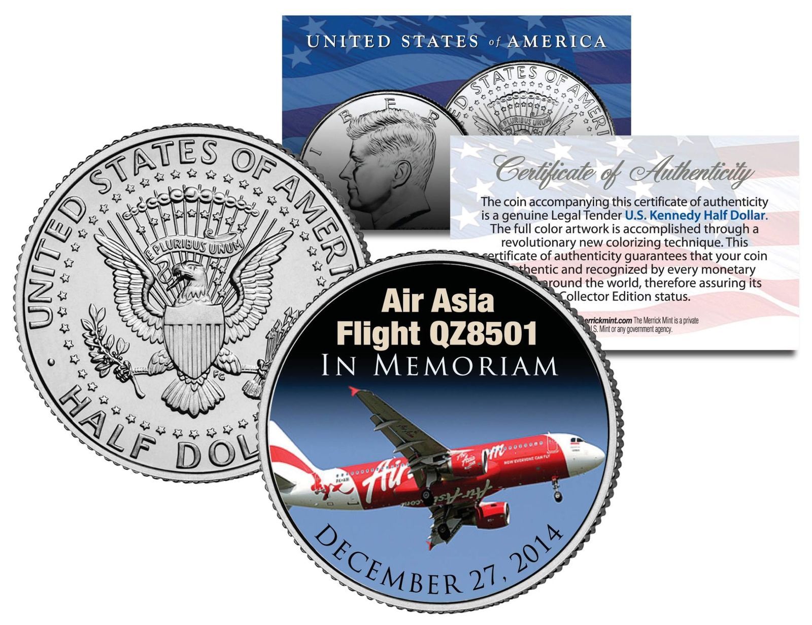 The AirAsia Flight QZ8501 plane was flying from Surabaya in Indonesia to Singapore on 27 December 2014 carrying 162 people when it crashed into the Java Sea. Here is your opportunity to own or to gift the AIR ASIA FLIGHT QZ8501 - IN MEMORIAM colorized 2014 JFK Kennedy Half Dollar U.S. Coin, which has been enhanced with a beautifully colorized image by the Merrick Mint. Each coin comes in a premium coin capsule with a full color Certificate of Authenticity to guarantee that your coin is authentic and recognized by every monetary authority around the world, assuring its Collector Edition status. This Legal Tender United States coin has been colorized with an application of special inks directly to the surface of the coin, using a unique and painstakingly multicolor coin process, which achieves a level of detail, color saturation, and durability that is #1 in the coin industry. The result is an everlasting colorized coin collectible of ultra-high quality. The 2014 Kennedy half dollar is a U.S. fifty cent coin with mint marks chosen at random.